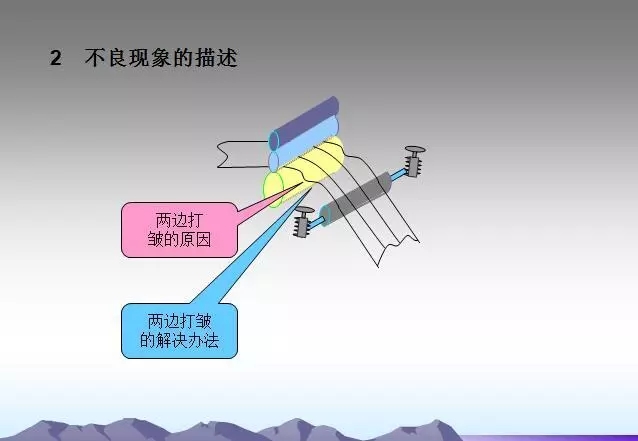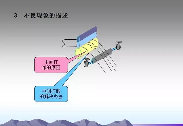輥緊固螺釘松動(dòng)原因造成各輥的平行狀態(tài)被破壞,此時(shí)會(huì)出現(xiàn)打皺現(xiàn)象。這種情況下,只要及時(shí)調(diào)整并緊固好即可。